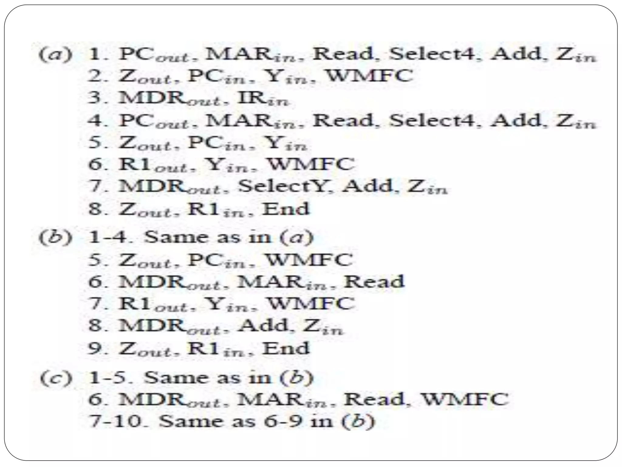 - Microprogrammed control stores sequences of control words (microinstructions) in a control store. It uses a microprogram counter to sequentially fetch microinstructions and generate control signals. This allows for more flexible control but is slower than hardwired.