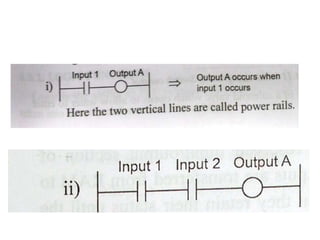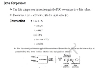 This document provides an overview of programmable logic controllers (PLCs). It describes the basic structure of a PLC including input/output modules, a central processing unit, memory, and a programming unit. The document outlines how PLCs are used for automation in industrial processes by replacing hardwired relay controls. It also discusses PLC programming using ladder logic and provides examples of logic functions, timers, counters, and data handling capabilities of PLCs. Selection factors for choosing a suitable PLC for an application are also mentioned.