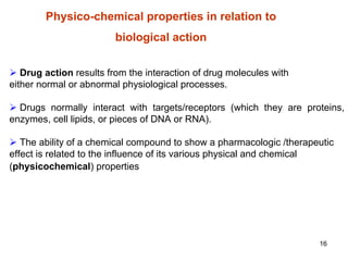The document discusses several key physicochemical properties that influence a drug's biological activity, including: