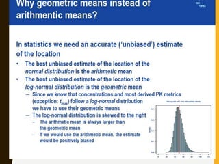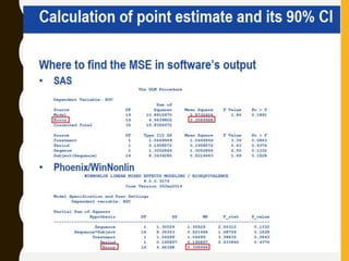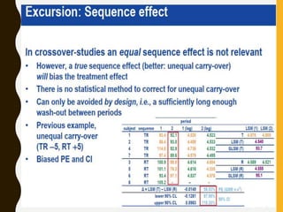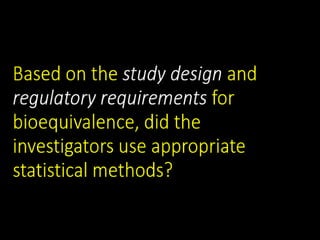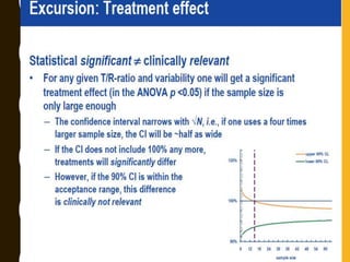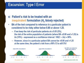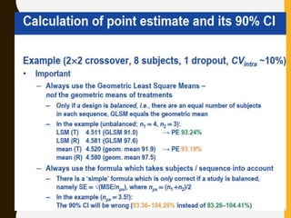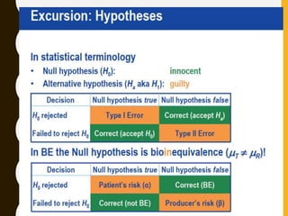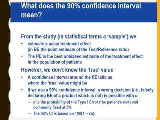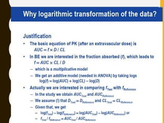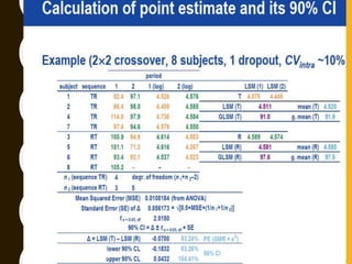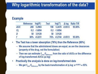 The document discusses statistical methods for determining sample sizes and analyzing pharmacokinetic (PK) measures to assess bioequivalence between test and reference formulations. It emphasizes the importance of hypothesis testing, outlining conventional methods and the inadequacies associated with them, particularly regarding conclusions on equality. Additionally, it details procedures for analyzing data using ANOVA and the factors influencing sample size calculations in bioequivalence studies.