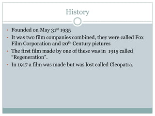 20th Century Fox was founded in 1935 through the merger of Fox Film Corporation and 20th Century Pictures. Some of their most successful films include Avatar, Star Wars, Ice Age, and Planet of the Apes. Avatar holds the records for both the highest domestic gross and worldwide gross of all time. 20th Century Fox also has many subsidiary production companies, including Fox Searchlight Pictures, Fox Television Studios, and Blue Sky Studios.