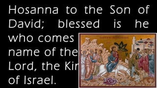 This document contains prayers, readings, and parts of the Mass for Palm Sunday. It includes passages from Isaiah and Philippians describing Jesus' humility and suffering. It also contains the reading of Jesus' cry of abandonment on the cross from Psalm 22. The Mass focuses on commemorating Christ's entrance into Jerusalem and his Passion.