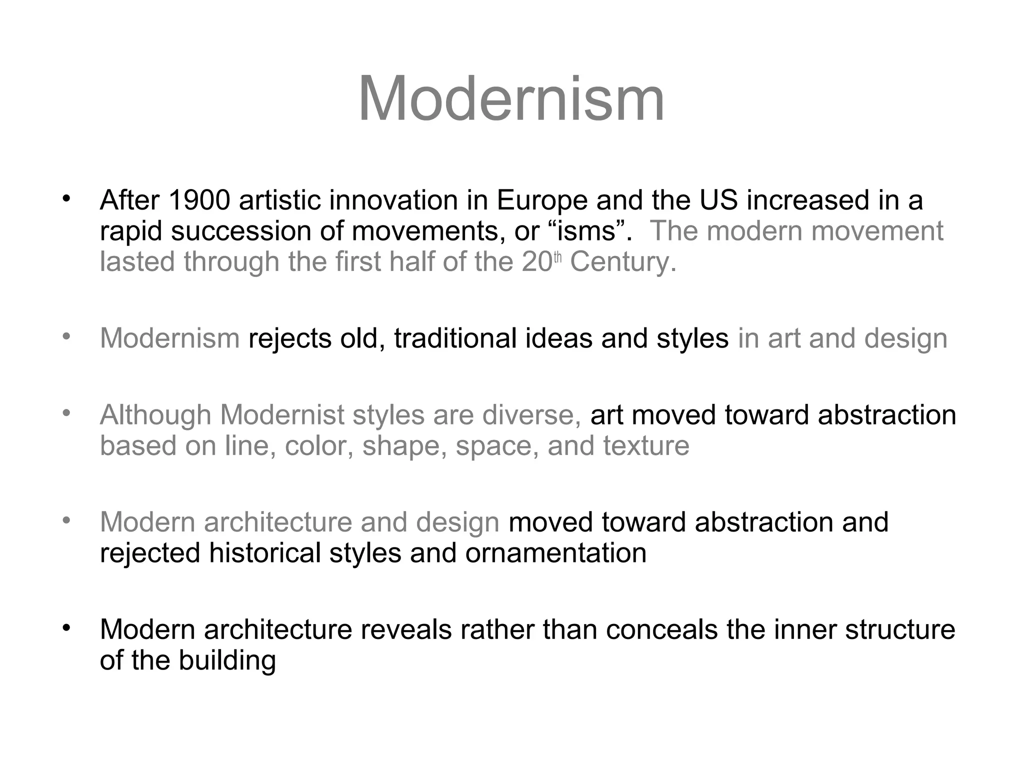 The document summarizes major architectural styles from the 20th century, including Modernism, Art Nouveau, De Stijl, Art Deco, the Bauhaus, Mid-Century Modern, and Post-Modernism. It provides examples of key works such as the Guggenheim Museum by Frank Lloyd Wright, the Barcelona Chair by Mies van der Rohe, and the Pompidou Center in Paris by Rogers and Piano. The styles reflected new technologies and materials as well as rejections or returns to historical references over the decades covered.