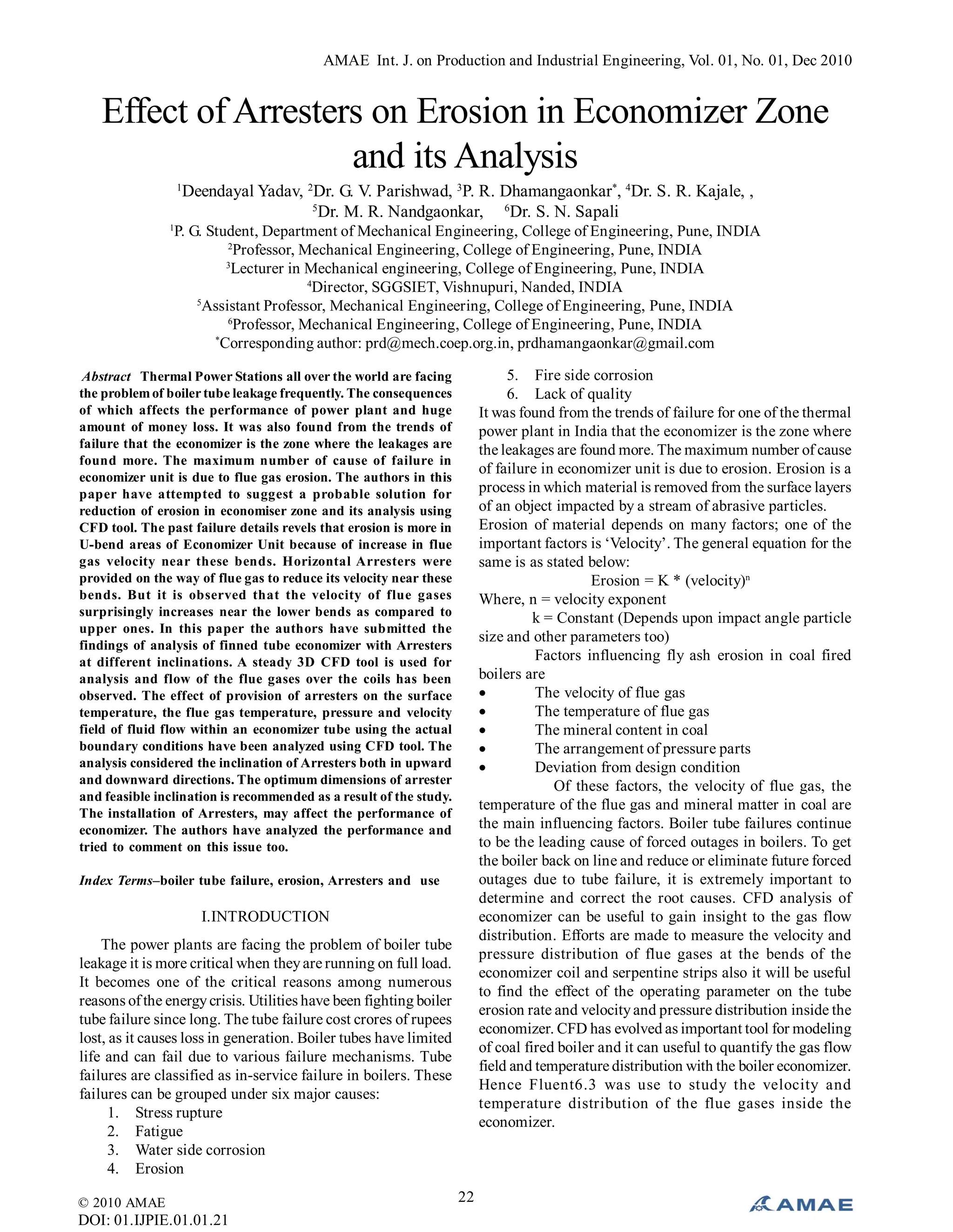 The document discusses the frequent boiler tube leakage issues in thermal power stations, particularly focusing on the economizer zone where flue gas erosion is prevalent. It evaluates the use of horizontal and inclined arresters to reduce flue gas velocity at critical U-bends, revealing that proper design and placement of arresters can mitigate erosion without adversely affecting the economizer's performance. Computational Fluid Dynamics (CFD) analysis is employed to optimize arrester dimensions and assess their impact on fluid flow and temperature within the economizer.
