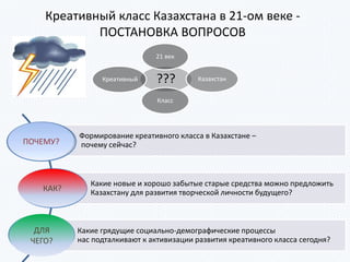 Документ анализирует формирование креативного класса в Казахстане в 21 веке, подчеркивая его роль как двигателя социально-экономического прогресса. Обсуждаются вызовы и возможности для молодежи в контексте культурного и образовательного развития, а также предложения по улучшению инфраструктуры для поддержки креативности. Особое внимание уделяется внедрению новых технологий в образование и необходимости сотрудничества в рамках евразийского интеллектуального пространству.