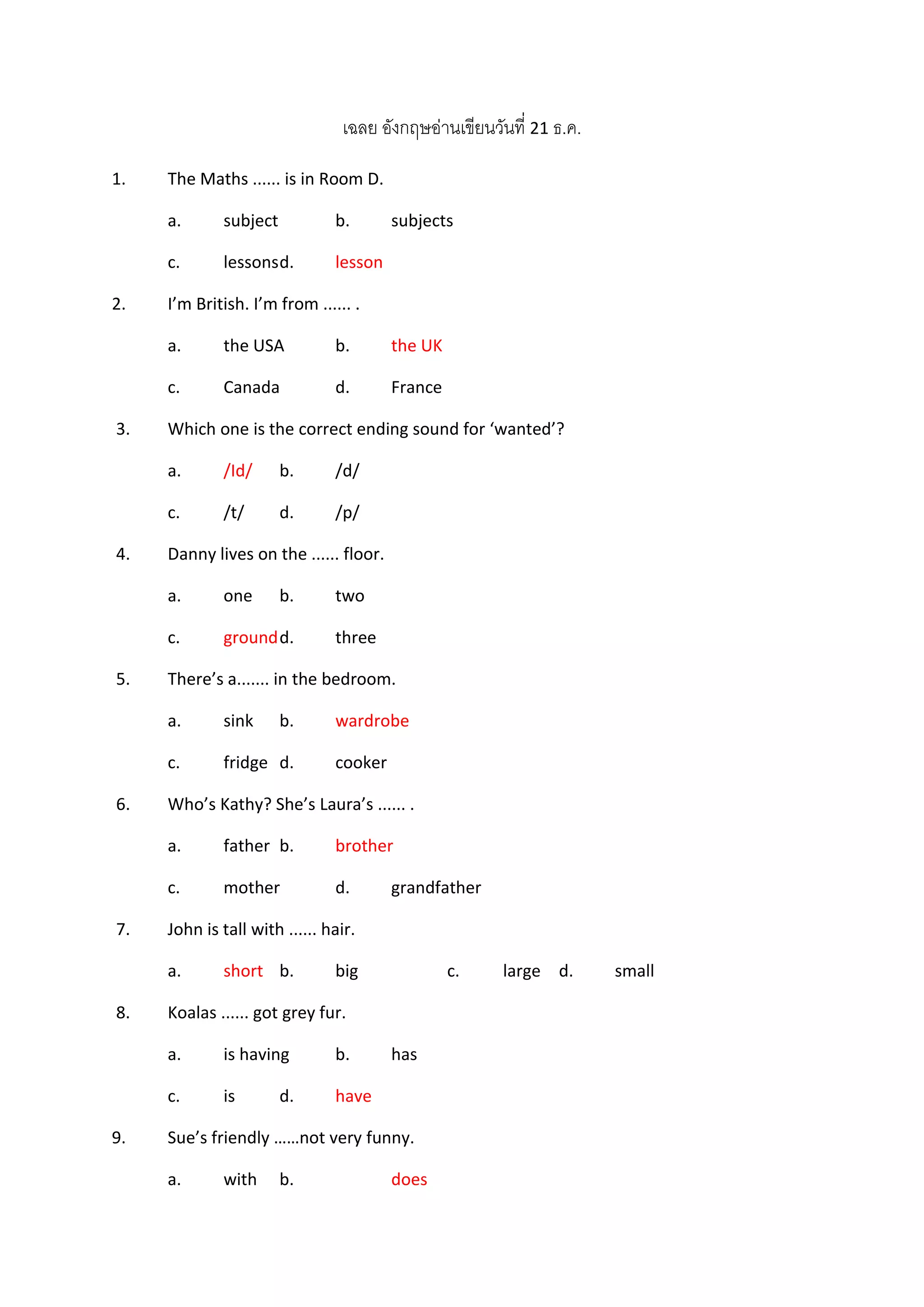 The document appears to be a reading comprehension test in Thai containing multiple choice questions about a passage describing the plot of the film Pirates of the Caribbean 2: Dead Man's Chest. It discusses the main characters including Captain Jack Sparrow played by Johnny Depp and their journey to find treasure while facing adventures at sea. The writer was initially skeptical but found the actors talented and the film exciting, especially Johnny Depp's comedic performance.