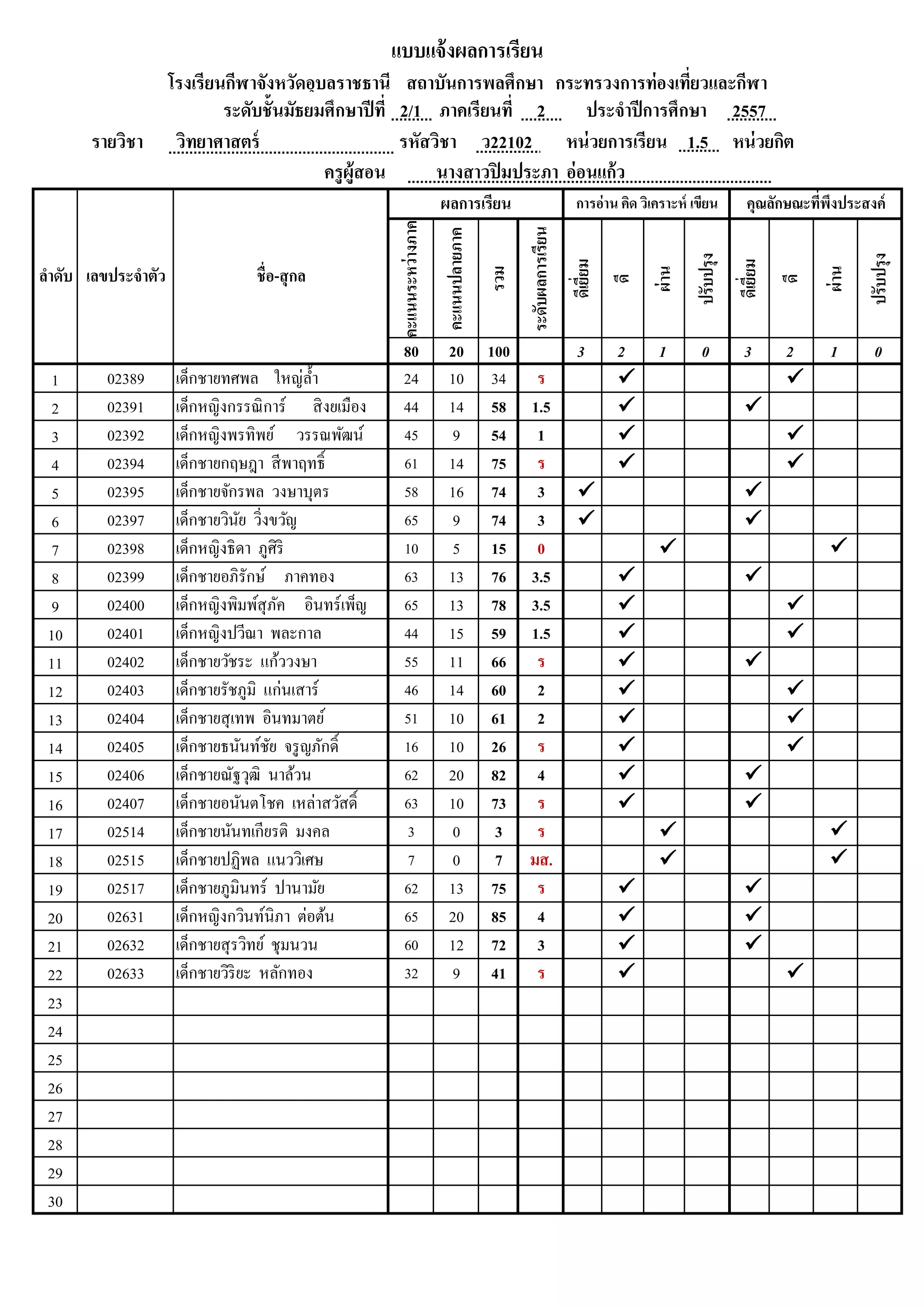2/1 2 วิทยาศาสตร์ 1.5 ครูผู้สอน คะแนนระหว่างภาค คะแนนปลายภาค รวม ระดับผลการเรียน ดีเยี่ยม ดี ผ่าน ปรับปรุง ดีเยี่ยม ดี ผ่าน ปรับปรุง 80