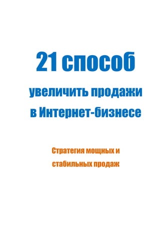 Документ описывает 21 метод повышения продаж в интернет-бизнесе, включая улучшение дизайна сайта, стратегию размещения контента и работу с клиентами. Основные акценты сделаны на важности профессионального внешнего вида, удобства покупки и эффективной коммуникации с клиентами. Почти все методы направлены на привлечение и удержание клиентов для достижения устойчивого роста продаж.