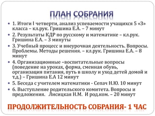 На родительском собрании 21 ноября 2013 года были подведены итоги первой четверти успеваемости учащихся 5 'з' класса, где 100% успеваемости, но качество на уровне 58%. Обсуждались результаты контрольных работ по русскому и математике, а также вопросы учебной и внеурочной деятельности. Родители представили свои вопросы и предложения, затрагивая организационные моменты, такие как поведение на уроках и питание.