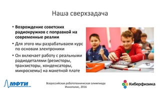 Документ представляет курс по основам электроники для школьников, основанный на возрождении советских радиокружков. Цель курса — развить техническую грамотность и абстрактное мышление у детей через практическое изучение электронных компонентов. Курс включает 5 занятий, каждое с теоретической и практической частью, и имеет планы по созданию онлайн-курса и методички.