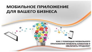 Документ описывает опыт и достижения предпринимателя в сфере разработки мобильных приложений, включая создание 25 приложений и обсуждение методов их продвижения. Он акцентирует внимание на преимуществах мобильных приложений для бизнеса, таких как улучшение коммуникации с клиентами через пуш-уведомления и программы лояльности. Также представлены детали разработ процесса приложений и услуги, предлагаемые компанией awiosapps.
