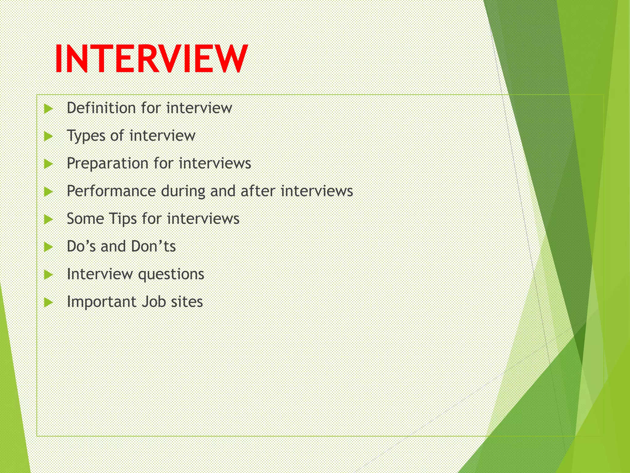 The document outlines interview skills and techniques, defining interviews and explaining preparation, performance, and follow-up processes. It covers types of interviews such as panel and face-to-face, important qualities expected from candidates, and offers tips on what to do and avoid during interviews. Key components include effective communication, proper body language, dressing appropriately, and preparing for common interview questions.