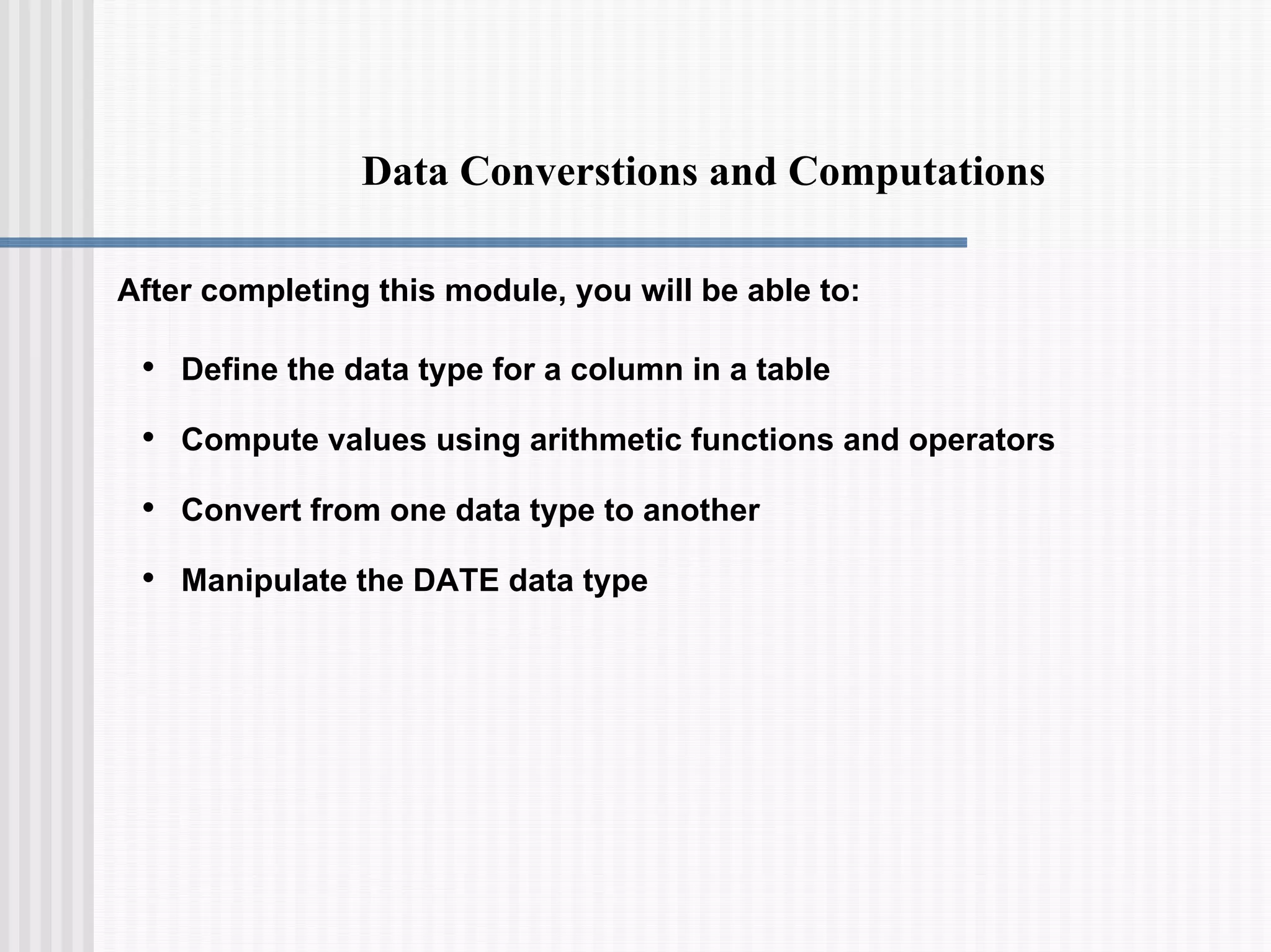 - Methods for converting between data types using CAST and implicit conversion are shown.