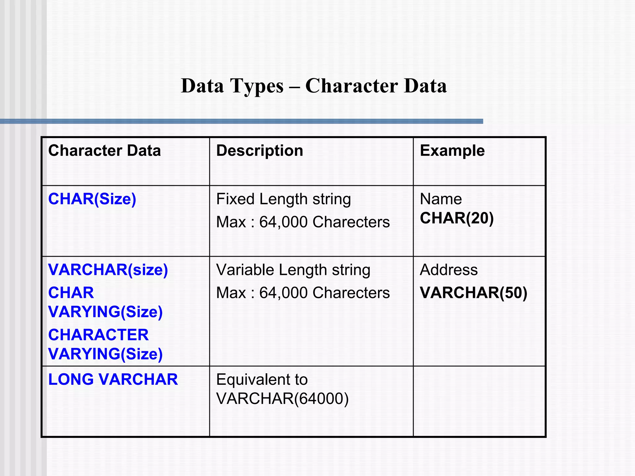 - It defines common data types like character, numeric, date/time and examples of each. Character types include VARCHAR and CHAR, numeric types include INTEGER, DECIMAL, and DATE.
