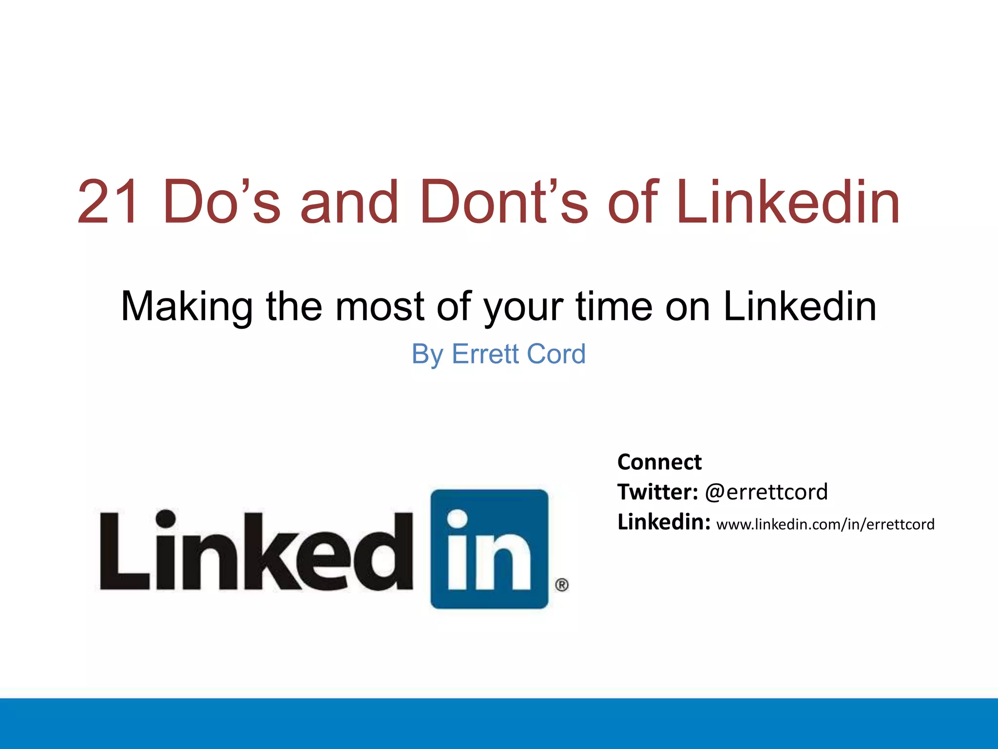 The document provides 21 tips for using LinkedIn effectively. It recommends personalizing connection requests and messages, writing custom thank you messages, upgrading to a premium account, endorsing followers, joining groups, regularly updating your profile, customizing website links, recommending others, getting involved in groups, being selective with connections, responding to all invitations, customizing invitations, and using the like feature to share helpful updates. It also advises against using bitly URLs, overusing certain descriptive words, sending multiple invites to one person, and connecting with everyone.