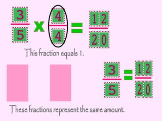 This document discusses making equivalent fractions by multiplying the numerator and denominator of a fraction by the same number. This does not change the value of the fraction because it is equivalent to multiplying by one. Examples are provided of filling in missing numerators to make fractions equivalent to the original when the denominator is changed. The purpose of making equivalent fractions is to allow for adding and subtracting fractions.