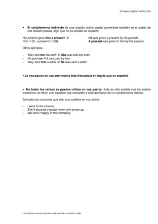 This document discusses the passive voice in English. It begins by providing examples of active and passive voice sentences. The passive is formed by making the direct object of the active sentence the subject of the passive sentence. The verb is changed to a form of "to be" plus the past participle of the main verb. The agent (person or thing performing the action) can be included after "by". The passive voice is used more frequently in English than Spanish. It can only be used with transitive verbs. The document also discusses using "get" instead of "to be" to express accidental or casual actions in the passive voice.