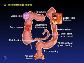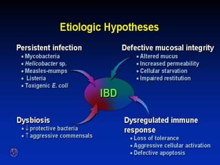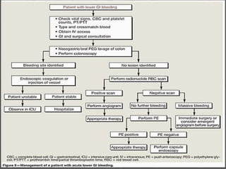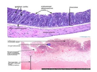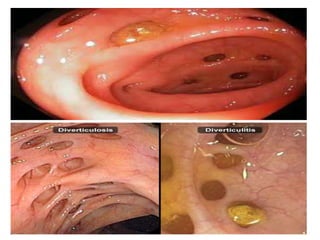 Lower GI bleeding can result from various causes in the colon and rectum. The most common etiologies are diverticular disease, which accounts for 60% of cases, and inflammatory bowel disease, which causes 13% of cases. Diverticulosis is characterized by outpouchings in the colon wall that are prone to bleeding. It is usually asymptomatic but can lead to complications like diverticulitis, abscesses, fistulas, and obstruction. Inflammatory bowel disease includes both Crohn's disease and ulcerative colitis, which cause transmural and mucosal inflammation respectively. Common symptoms of lower GI bleeding include hematochezia and melena. Treatment depends on the underlying cause but may involve medications, surgery