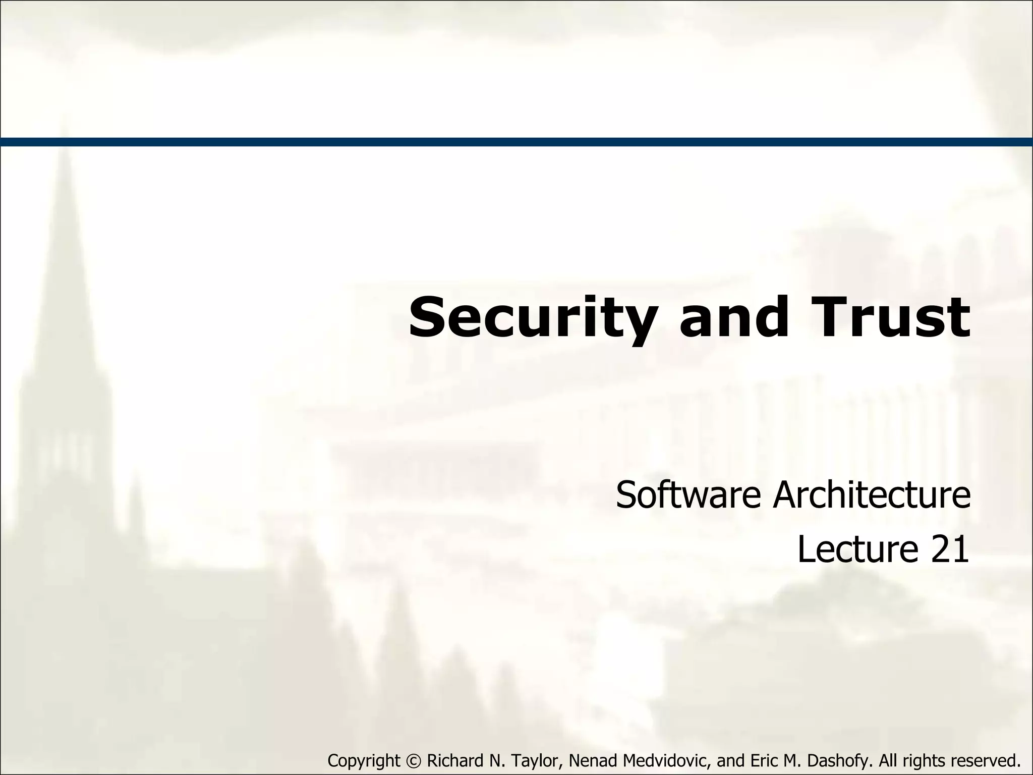 The document discusses architectural approaches to decentralized trust management. It proposes an architectural style called PACE (Practical Architectural approach for Composing Egocentric trust) to address trust in decentralized applications. PACE divides an entity's architecture into four layers - communication, information, trust, and application - to encapsulate a reputation-based trust model and counter common threats in decentralization like impersonation and fraud.
