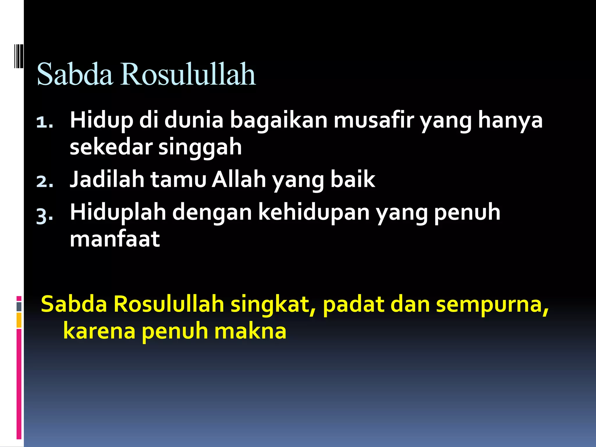 1. Dokumen tersebut membahas tentang kebijaksanaan yang diberikan oleh sabda-sabda Nabi Muhammad SAW dan kebenaran agama yang terkandung di dalam hati setiap manusia.