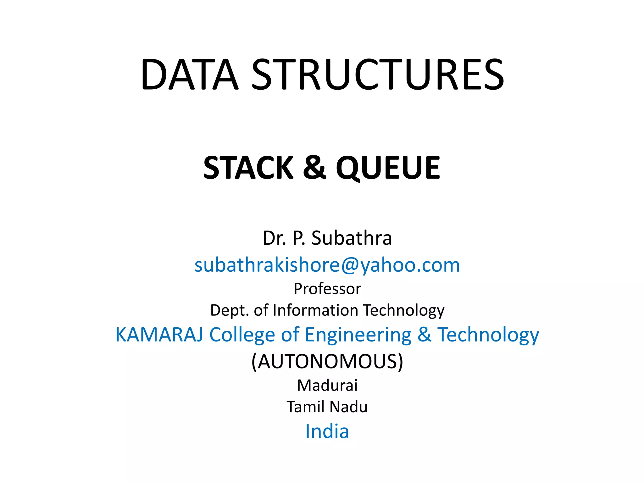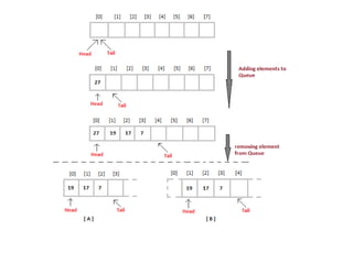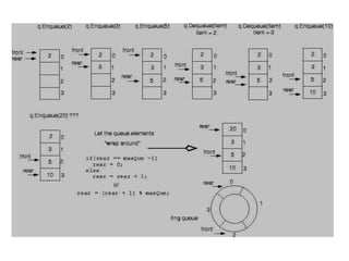 This document discusses data structures stacks and queues. It provides definitions and examples of stacks and queues. Stacks follow LIFO (last in first out) and are useful for undo sequences and function calls. Queues follow FIFO (first in first out) and are useful for things like printer queues. The document discusses implementations of stacks and queues using arrays and linked lists. It provides pseudocode for common stack and queue operations like push, pop, enqueue, dequeue.