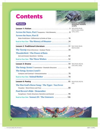 This document is the table of contents for a reading comprehension workbook that provides lessons and passages on various fiction and nonfiction genres. The workbook is organized into 10 lessons covering genres such as fiction, poetry, drama, historical texts, scientific texts, and more. Each lesson includes introductory information on the genre, two related passages to read and analyze, and additional independent reading. Graphic organizers and worksheets are provided in the tools section to accompany selected passages.
