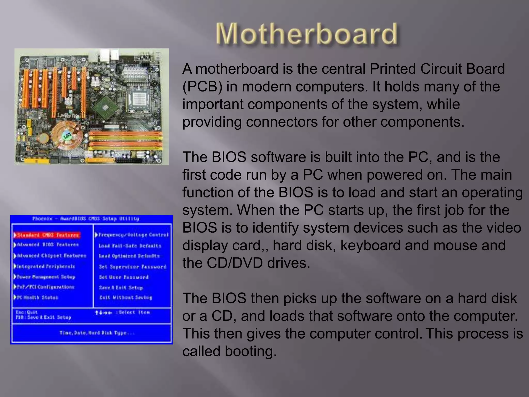 The motherboard holds important components and connects other components. The BIOS software initializes devices and loads the operating system at startup. RAM temporarily stores the operating system, applications, and data for quick processor access while powered on. The hard drive permanently stores data, files, and the operating system. The graphics card outputs images to displays. The sound/audio card handles audio input/output. The CPU processor carries out program instructions to process data. The network card physically connects the computer to a local area network.