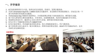 该文档概述了2014年至2015年间哥伦比亚大学校园内的福音活动,包括新生欢迎聚会和福音聚会,旨在传扬耶稣基督,吸引学生参与,最终有47位弟兄姊妹受浸。文中还强调了对新人的牧养活动,如晨兴小组和初信训练。展望2015-2016学年,希望进一步扩展福音影响力,并在校园内建立更多的聚会与团体。
