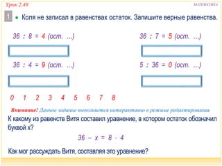 Документ представляет собой описание урока математики для 3 класса по теме деления трехзначных чисел на однозначное. Урок включает интерактивные задания, примеры деления и проверки результатов, а также вопросы для размышления учащихся. Презентация разработана учителем Анной Васильевной Татузовой и направлена на развитие навыков вычисления и логического рассуждения.