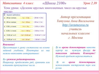 Презентация для урока математики 4 класса охватывает тему деления многозначных чисел и включает интерактивные задания. Учитель Татузова Анна Васильевна предоставляет различные задачки на деление, нахождение расстояний и расчет скоростей поездов, а также преобразования единиц измерений. Документ содержит методические указания и примеры выполнения математических операций.