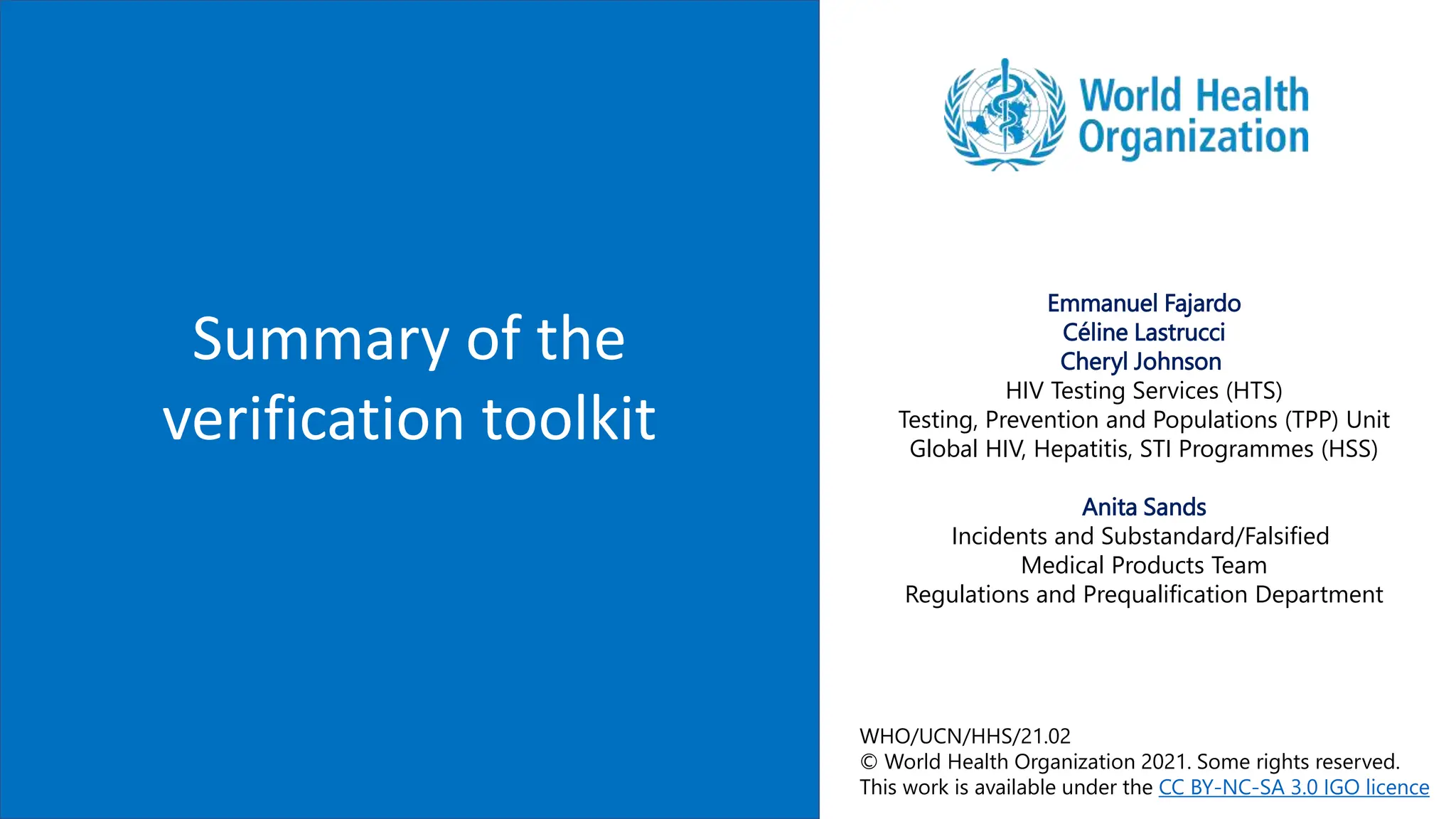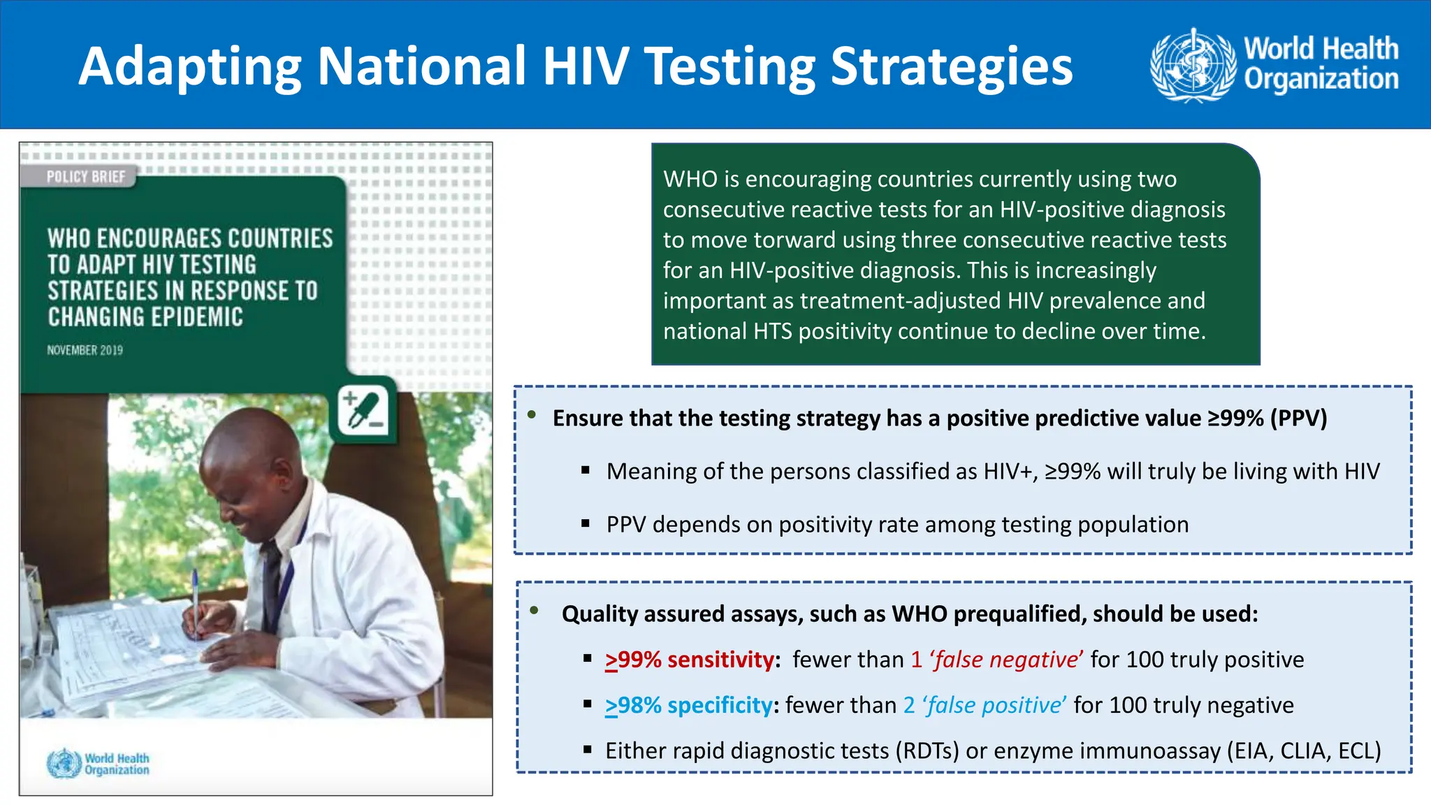 The document provides guidance on conducting a verification study to select quality-assured HIV testing assays and optimize national HIV testing algorithms. It recommends establishing a verification panel of 250 HIV-negative specimens and testing 8-12 candidate assays to identify those with the lowest false reactivity and shared false results. The verification study process involves preparing study tools, selecting sites, testing the panel, analyzing results, and choosing optimized algorithms. It also outlines tools developed by WHO to assist countries in planning and executing verification studies.