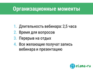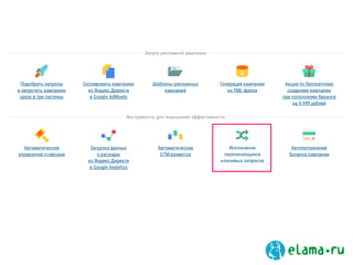 Документ представляет собой план вебинара на тему повышения эффективности контекстной рекламы, включая основные принципы, правила и способы оптимизации рекламы через автоматизацию. Он также содержит организационные моменты, данные об объемах рекламного рынка и важные аспекты для повышения CTR и снижения CPC. В заключение, предоставлены рекомендации по автоматизации управления кампаниями и оптимизации расходов.