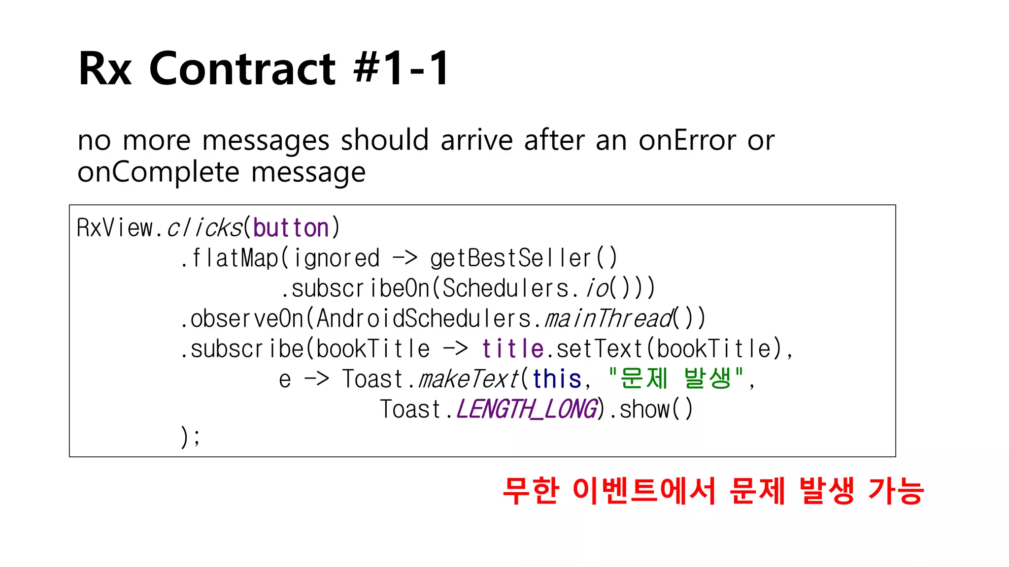 1. RxJava contracts such as not allowing null values in streams, serialized emission of events, and requiring onComplete calls.