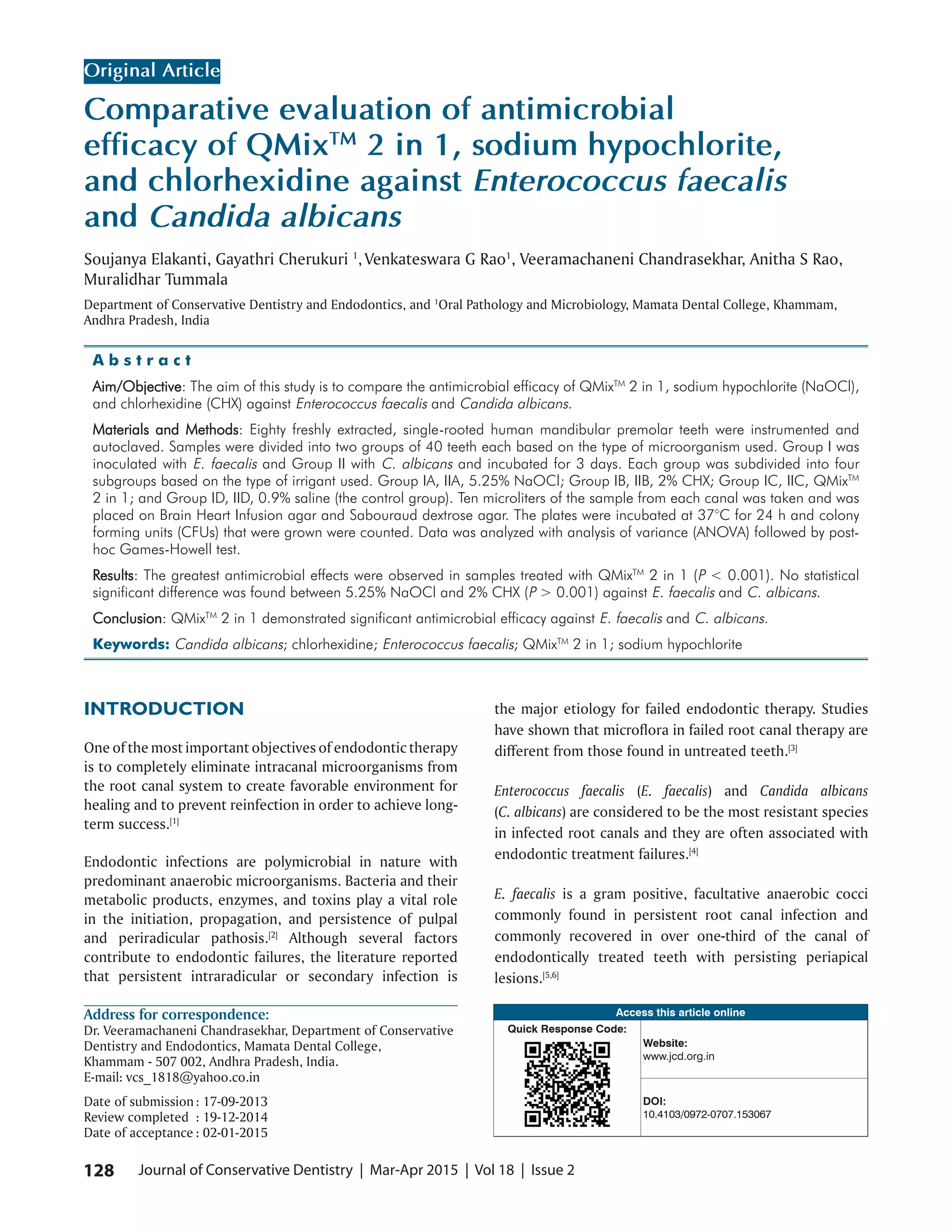This study compared the antimicrobial efficacy of QMix 2 in 1, sodium hypochlorite (NaOCl), and chlorhexidine (CHX) against Enterococcus faecalis and Candida albicans. Eighty single-rooted teeth were inoculated with either E. faecalis or C. albicans and then irrigated with one of the three test irrigants. Colony forming units were significantly lower in canals irrigated with QMix 2 in 1 compared to NaOCl and CHX, demonstrating greater antimicrobial efficacy. NaOCl and CHX showed similar efficacy with no significant difference. This study suggests that QMix 2 in 1 is more effective at eliminating E