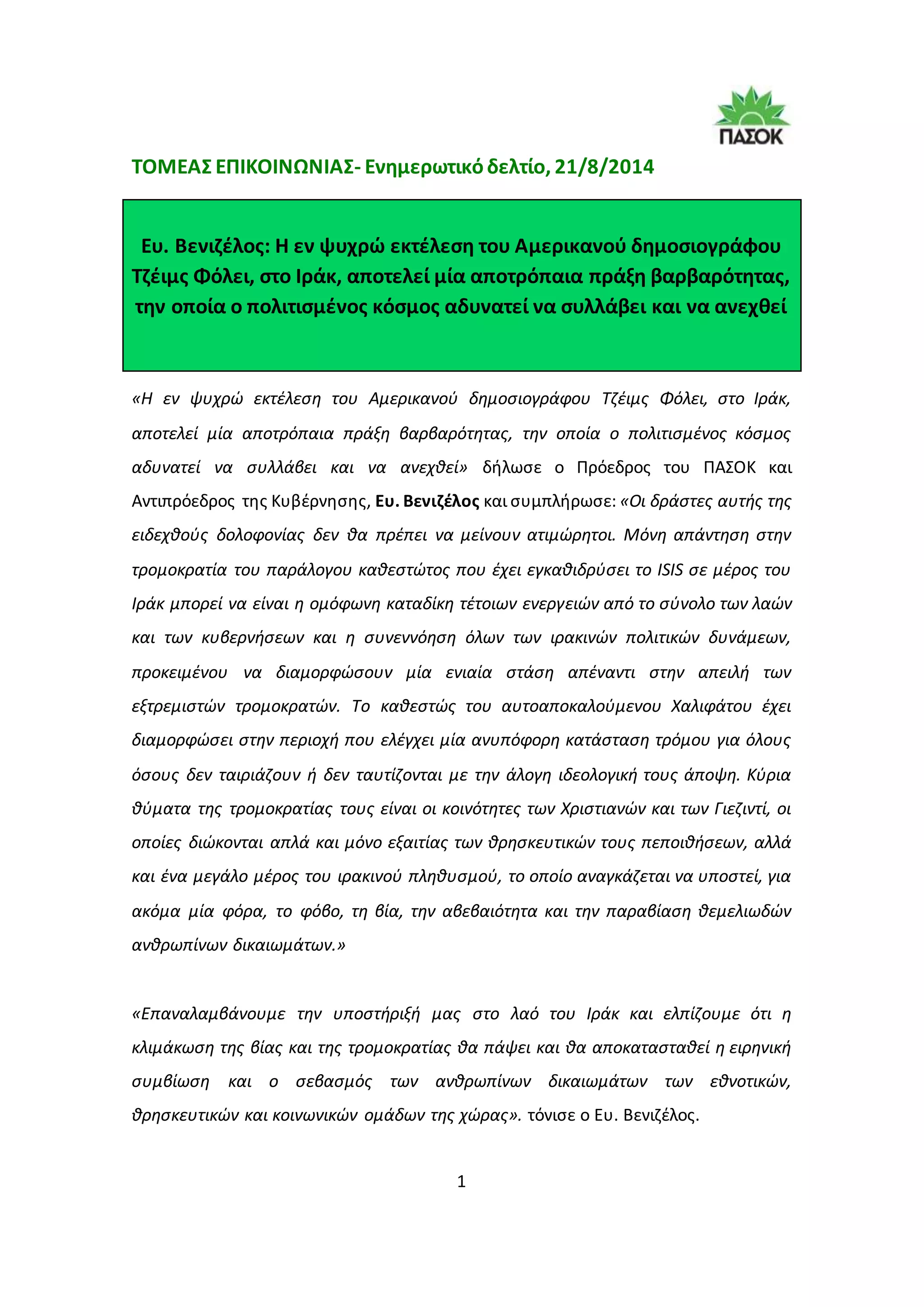 -Ευ. Βενιζέλος: Η εν ψυχρώ εκτέλεση του Αμερικανού δημοσιογράφου Τζέιμς Φόλει, στο Ιράκ, αποτελεί μία αποτρόπαια πράξη βαρβαρότητας, την οποία ο πολιτισμένος κόσμος αδυνατεί να συλλάβει και να ανεχθεί.