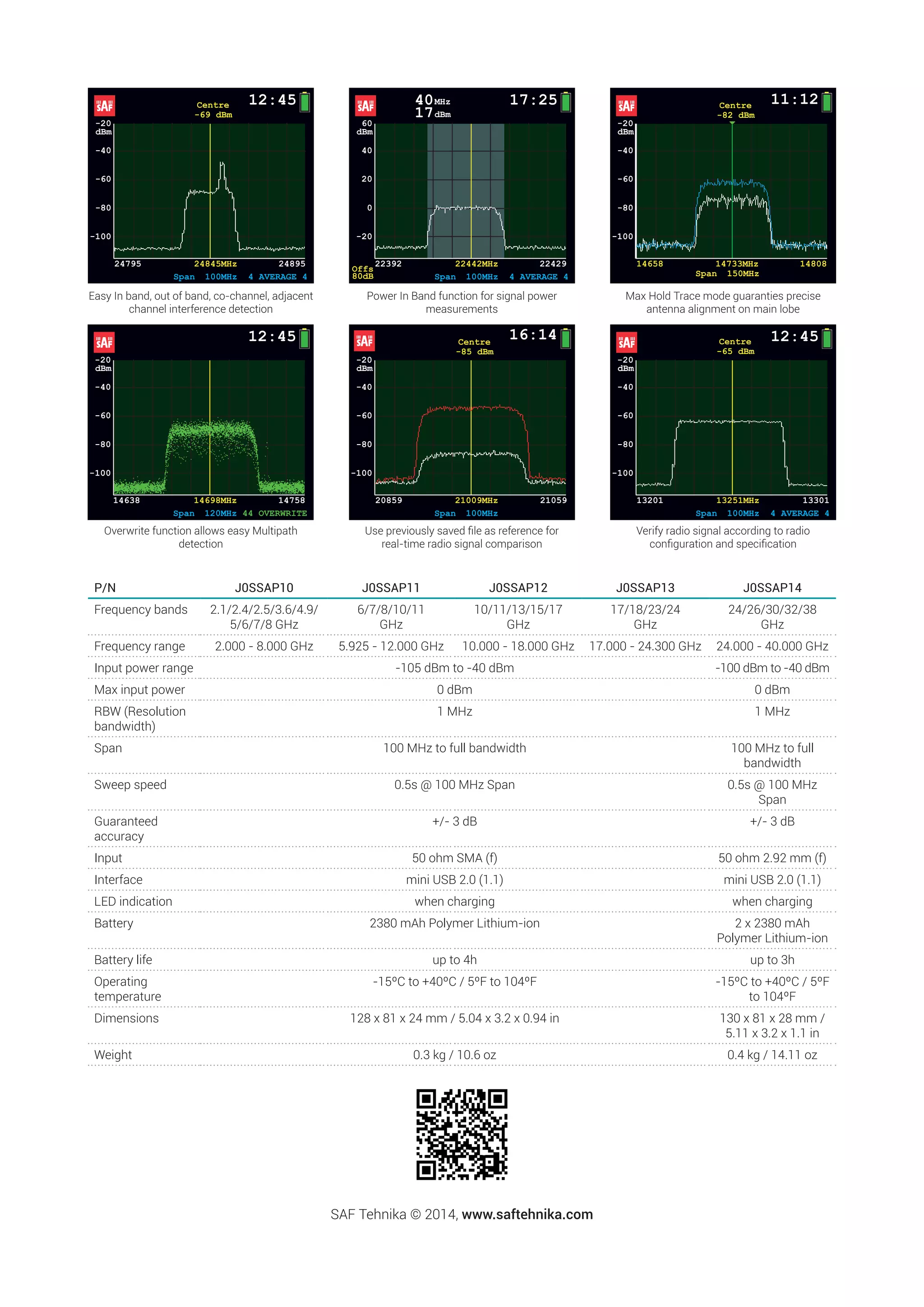 This document summarizes the specifications of the Spectrum Compact spectrum analyzer from SAF Tehnika. It has a high receiver sensitivity down to -105 dBm and supports frequency ranges from 2 GHz to 40 GHz across multiple models. It has an intuitive touchscreen interface and long battery life, making it suitable for installation, maintenance and troubleshooting of antenna systems.