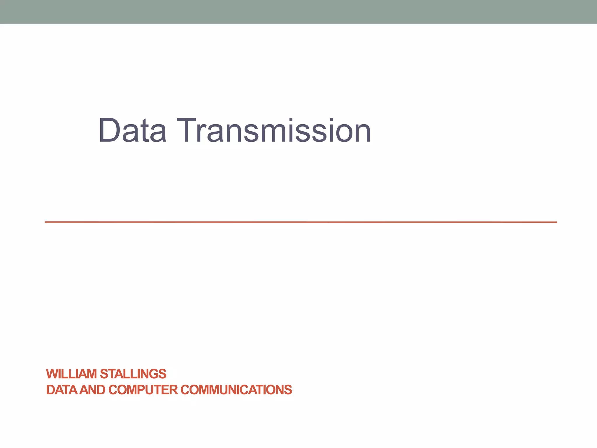 This document discusses key concepts related to data transmission. It defines common terminology used in transmission including transmitter, receiver, medium, direct/point-to-point/multi-point links, and simplex/half-duplex/full-duplex transmission. It also covers frequency domain concepts such as continuous/discrete signals, periodic/aperiodic signals, bandwidth, and how data rate relates to bandwidth. Finally, it compares analog and digital transmission and some common transmission impairments like attenuation, delay distortion, and noise.