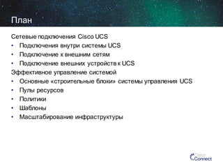 Документ описывает интеграцию и внедрение системы Cisco UCS, включая архитектуру, управление ресурсами, сетевые подключения и управление на основе политик. Рассматриваются основные компоненты системы, такие как фабрики и модули ввода-вывода, а также управление сервисными профилями и шаблонами. Приведены практические аспекты подключения к внешним сетям и устройствам, акцентируясь на эффективности и гибкости управления инфраструктурой.