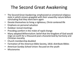 This document summarizes religious and social reform movements that occurred in the United States between 1820-1860, during the period known as the Second Great Awakening. It describes the rise of evangelical Christianity and revivalism, as well as new religious groups like the Mormons. It also discusses the transcendentalist movement and thinkers like Emerson and Thoreau. Reform efforts related to health, education, temperance and abolition are outlined. In particular, it provides details on William Lloyd Garrison and the growth of the abolitionist movement in the 1830s.