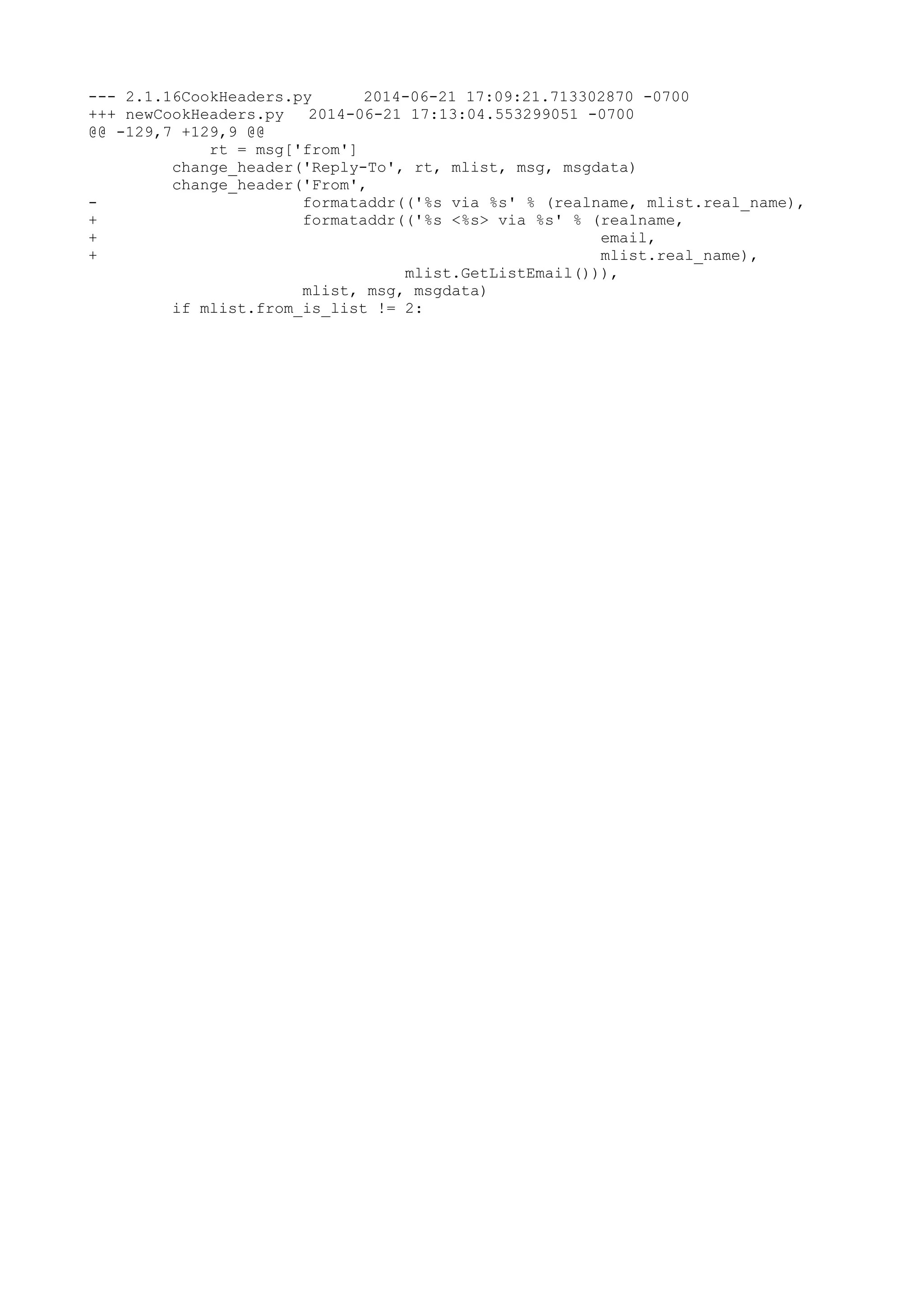 This document contains code changes to a Python file called CookHeaders.py. The changes update the formatting of the "From" header for emails sent via a mailing list. Specifically, it modifies the header to include the user's email address within angle brackets in addition to their name, and it also adds the mailing list real name. This improves the formatting of the "From" header for emails going through the mailing list.
