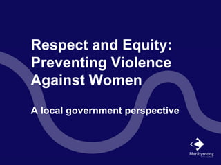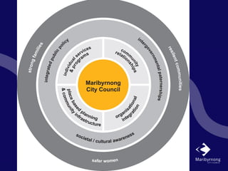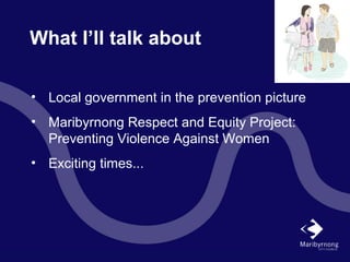 The City of Maribyrnong Respect and Equity Project aims to prevent violence against women by addressing its determinants across the local government's core business areas. This includes policies, programs, services, and partnerships focused on maternal and child health, youth, older adults, children's services, public spaces, human resources, community centers, economic development and community projects. The project seeks to create an organizational culture that integrates violence prevention and support community efforts, using networks to spread awareness. If successful, it will help women in the community live free from violence.