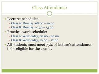 This document provides information about an introduction to object-oriented programming course in Java at Kristen Maranatha University. It includes the course schedule, attendance policy, textbook and reference recommendations, practical work guidelines, required software and tools, and the course syllabus. The course covers basic concepts of OOP in Java like classes, objects, methods, attributes, encapsulation, inheritance, polymorphism, abstract classes, interfaces, exceptions, collections, and GUI programming. It also provides examples of simple Java programs.