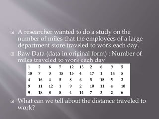 This document discusses organizing raw data from a study on employee commute distances into a grouped frequency distribution. The raw data consists of the number of miles each employee traveled to work each day. To draw useful conclusions, the data is organized into a table with class intervals, tallies of data points within each interval, and cumulative frequencies. The document provides guidelines for determining class limits and widths to properly categorize the data while maintaining mutually exclusive and exhaustive classes of equal size. Organizing data into a frequency distribution in this way facilitates analysis and presentation of the distribution's shape.