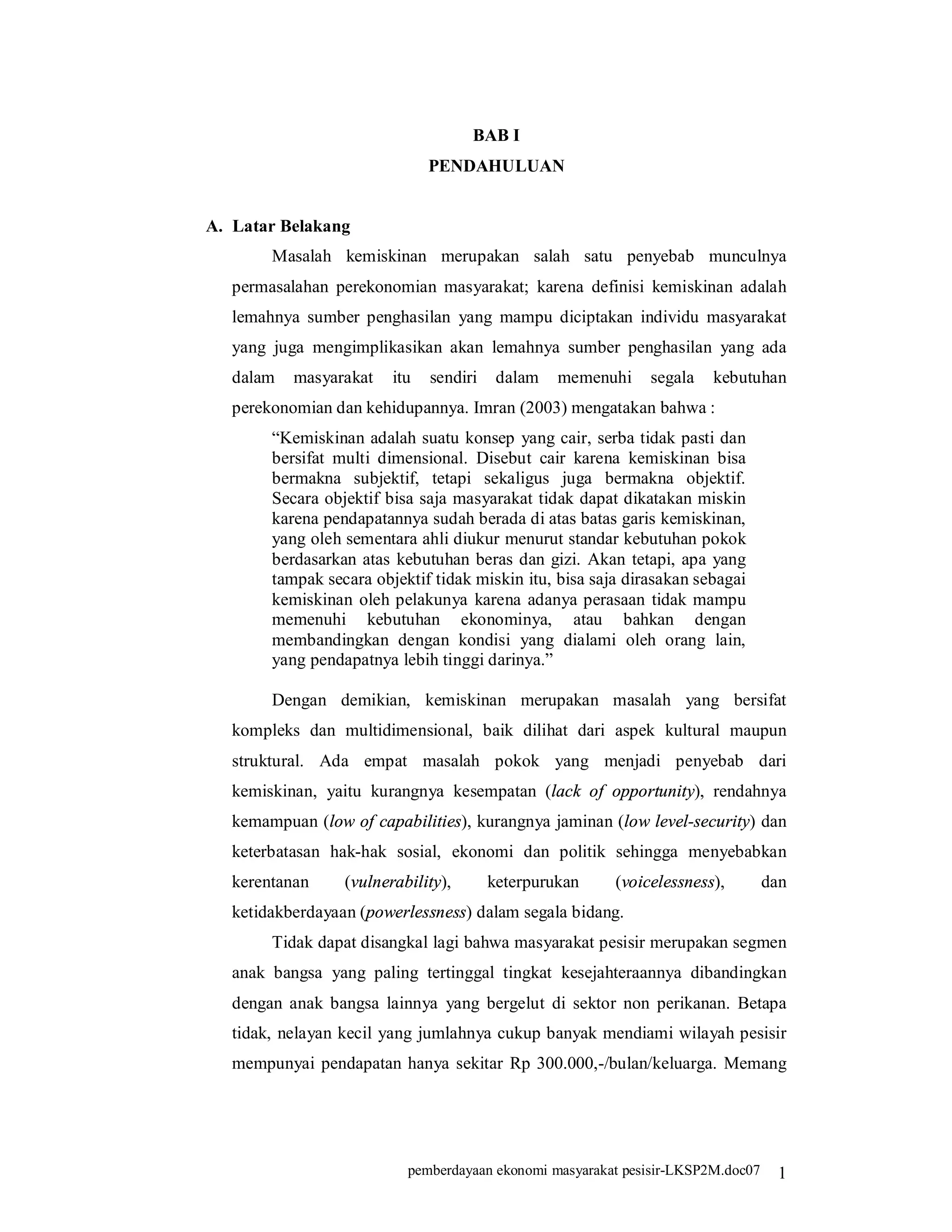Dokumen tersebut membahas tentang pemberdayaan ekonomi masyarakat pesisir melalui program Swamitra Mina di Kabupaten Lombok Timur. Swamitra Mina didirikan untuk meningkatkan akses masyarakat pesisir terhadap modal usaha, menggantikan peran tengkulak dan rentenir, namun perlu dievaluasi dampak sosial dan ekonominya. Dokumen ini juga menjelaskan latar belakang masalah kemiskinan di masyarakat pesisir s