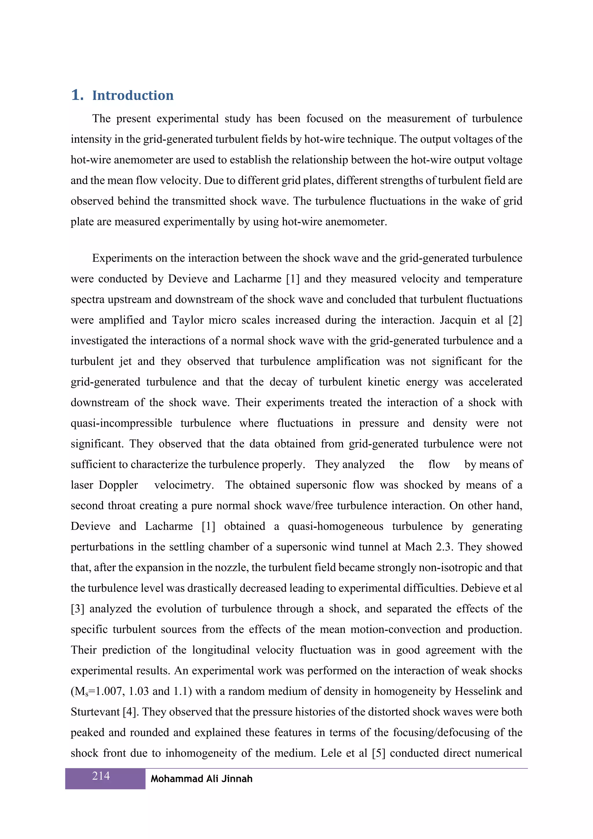 This document discusses an experimental investigation of shock/turbulence interaction using hot-wire anemometry to measure turbulence intensity before and after the interaction. It highlights the findings that turbulence intensity fluctuations are amplified more significantly for lower open area grid plates and details on the methods for numerical simulation and data analysis. Additionally, the study establishes the relationship between hot-wire anemometer output and mean flow velocity, contributing to insights on the behavior of turbulence in response to shock waves.