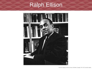 Ralph Ellison was born in Oklahoma in 1914 and attended Tuskeegee Institute on a scholarship where he studied music and played trumpet. He moved to New York City in 1936 where he met novelist Richard Wright and began writing his novel Invisible Man in 1945, which was published in 1952. Invisible Man tells the story of an unnamed narrator who feels invisible in society due to the color of his skin and explores themes of individualism, identity, and racism in America.