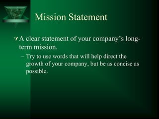 This business plan outlines the key elements needed for a new company. It includes a mission statement, details on leadership and their experience, an analysis of market opportunities and competition, goals for revenue and market share over five years, financial projections, resource needs, risks, and issues to address. The plan provides a framework to guide the growth of the company and direction for fundraising efforts.