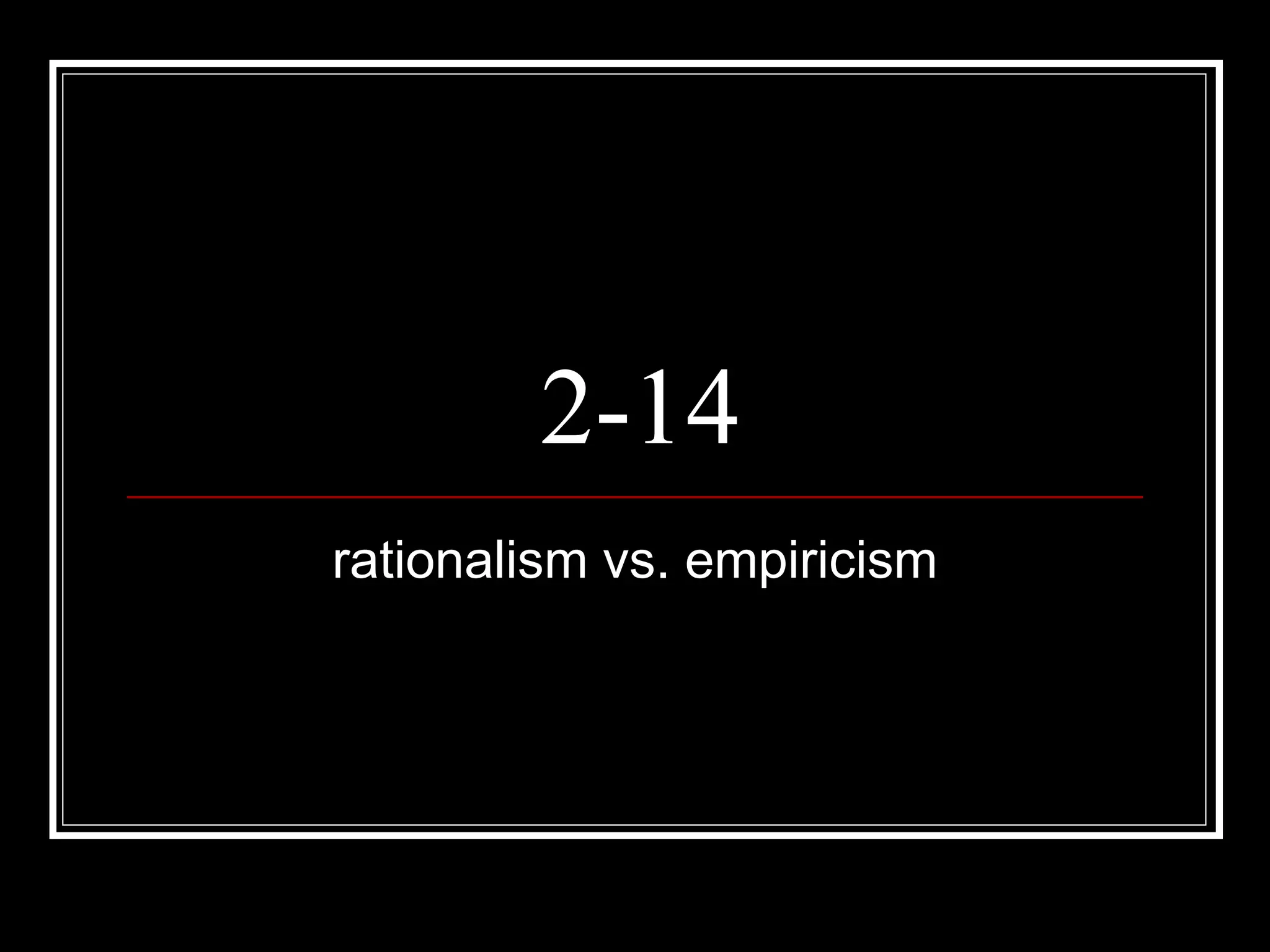 Rationalism holds that some knowledge comes from intuition alone or can be deduced from intuitive knowledge. The intuition/deduction thesis claims that some propositions can be known intuitively and others deduced from them. The innate knowledge thesis says we have innate knowledge as part of our rational nature. The innate concept thesis says we have innate concepts. Empiricism claims all knowledge comes from experience, either external sense experience or internal reflection. Locke argued against innate ideas and said knowledge comes only from sensation and reflection on sense experiences. While rationalism and empiricism differ on the source of knowledge, some overlap exists between the views.