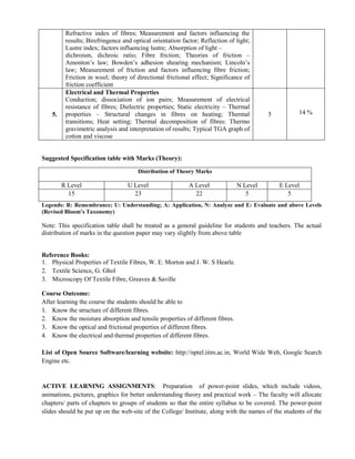 This document provides an overview of the Fibre Physics course offered at Gujarat Technological University. The course covers the physical properties of textile fibers including their structure, moisture absorption, tensile properties, optical properties, frictional properties, electrical properties, and thermal properties. It is a 3-credit course taught over 3 lecture hours per week. Student assessment includes tests, assignments, and an end of semester exam worth a total of 100 marks. The content is divided into 5 modules focusing on fiber structure, moisture absorption, tensile properties, optical and frictional properties, and electrical and thermal properties. Upon completing the course, students should have an understanding of the key physical properties of different textile fibers.