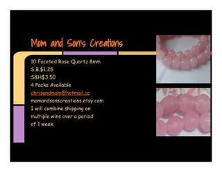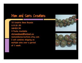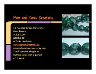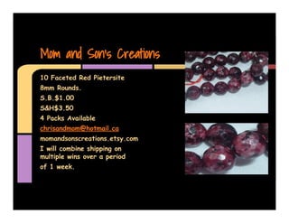 Riley's Emporium is hosting an online celebration for the Olympics featuring various handmade jewelry and craft items available for bidding and purchase. Items include necklaces, earrings, charms, and seed beads, with prices starting as low as $1, along with details for shipping and seller contact information. The document provides a comprehensive list of products, starting bids, and seller details for interested buyers.